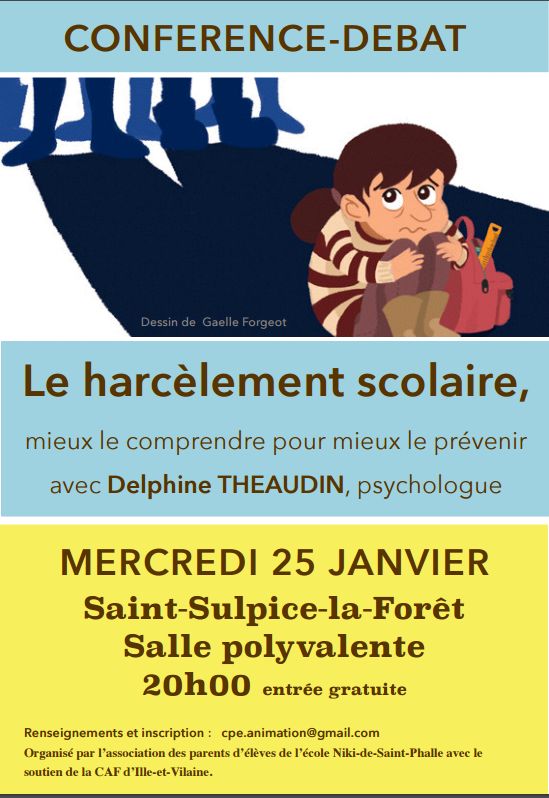 L’association des parents d’élèves FCPE de St Sulpice la Forêt organise une conférence sur le thème du harcèlement scolaire.