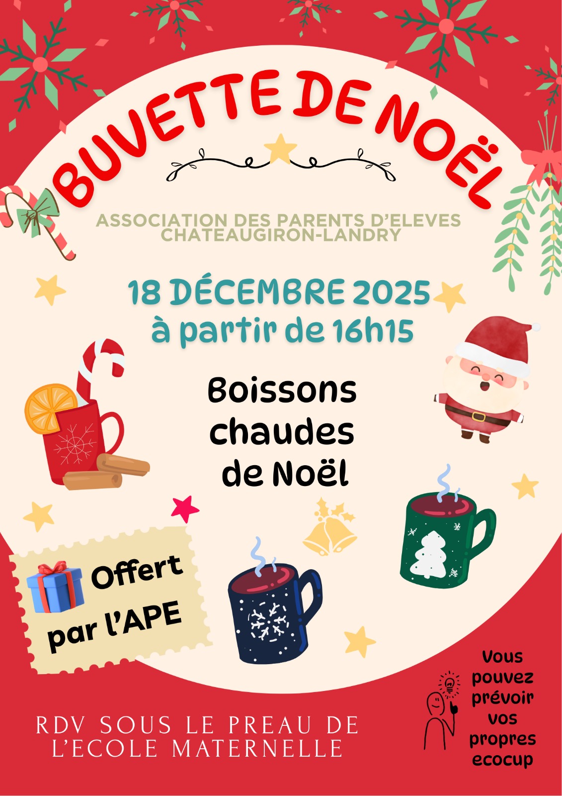 Un beau succès pour cette 1ère buvette de Noël organisée le jeudi 18 décembre dans la salle de motricité de l’école maternelle après le spectacle des enfants. Vous avez été très nombreux à venir partager un petit moment de convivialité avant la pause de Noël et nous vous remercions chaleureusement pour votre présence.